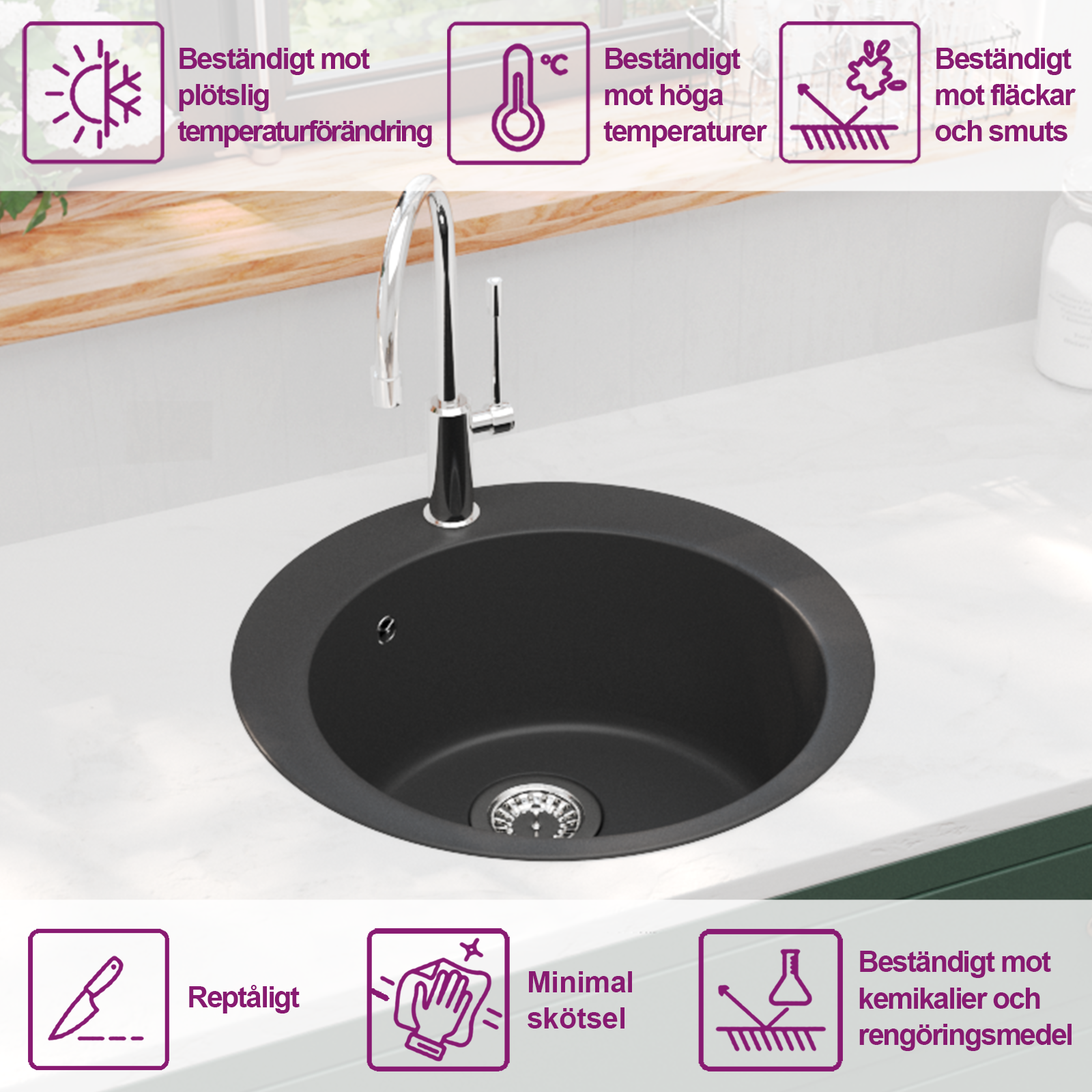 Den högkvalitativa granit som används gör disken rep- och värmebeständig och slitstark samt lätt att rengöra. En korgsil ingår också för enkelt avlägsnande av skräp. Handfatet är enkelt att montera.
