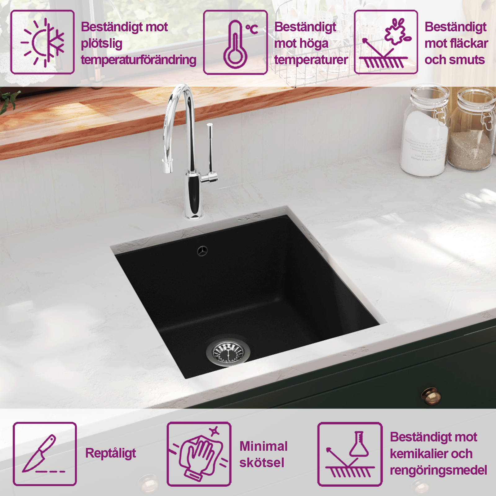 Den högkvalitativa granit som används gör disken rep- och värmebeständig och slitstark samt lätt att rengöra. En korgsil ingår också för enkelt avlägsnande av skräp. Handfatet är enkelt att montera.