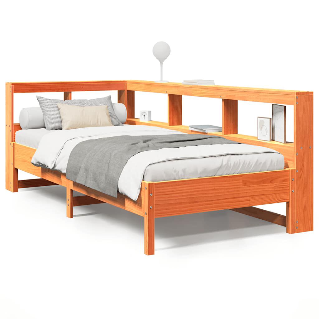 vidaXL Säng med bokhylla utan madrass vaxbrun 100x200 cm massiv furu