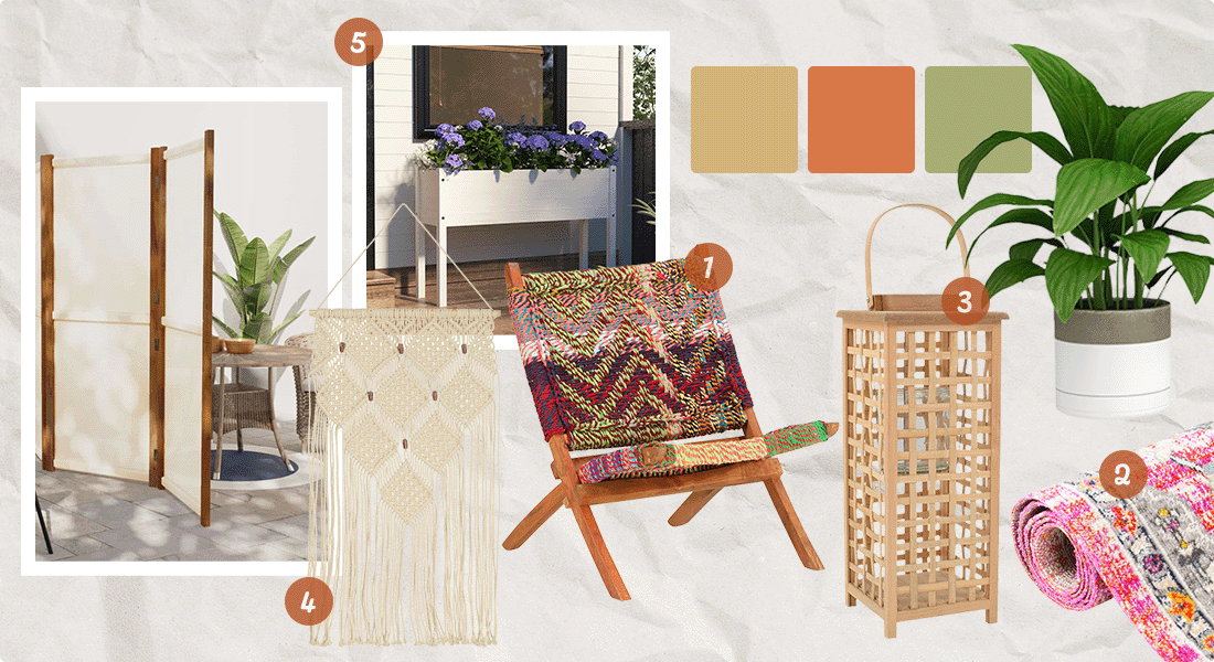 Välj handgjorda accenter, runda former, mjuka mönster med organiska mönster och massor av växter till din balkong i boho chic stil.