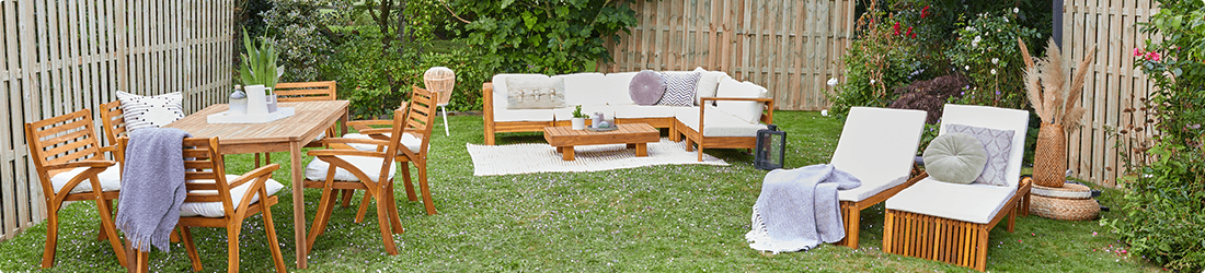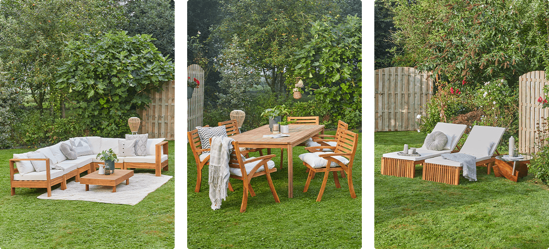 Trädgårdsmöbler i trä målar bilden av en avkopplande men elegant och trendig trädgårdsinredning. Träets mångsidighet gör att du kan styla din uteplats som du vill. Furu, teak och vit ek har ljusare nyanser, perfekt för en somrig trädgårdsdesign. Acaciaträ har djärva och eleganta toner, medan färgen på mahogny eller rosenträ ger din uteplats en vintagekänsla.