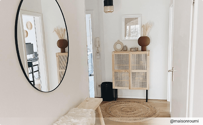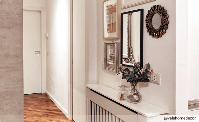 En spegel i hallen har dubbla funktioner. Den behövs helt klart. Om du har ett litet rum så gör en spegel att det ser ljusare och rymligare ut. Spegeln reflekterar ljuset och skapar en illusion av att hallen är större. Lek med olika former och ramar för att markera den dekorativa effekten.